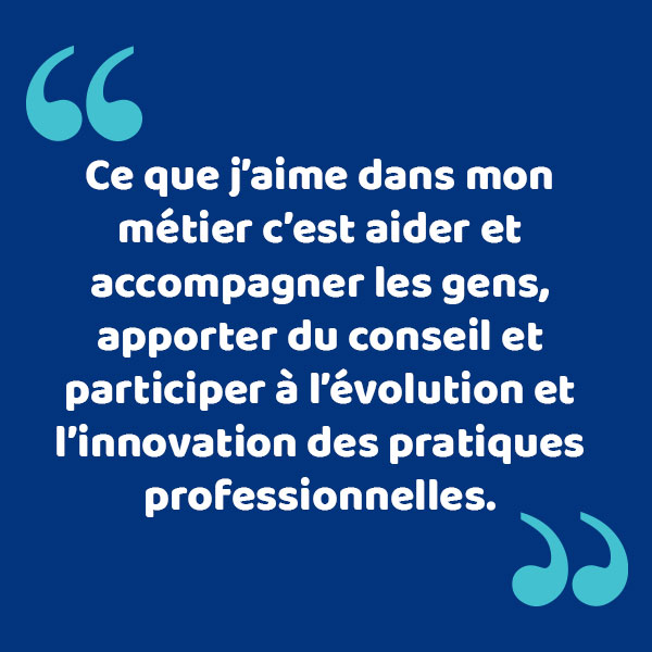 Ce que j’aime dans mon métier c’est aider et accompagner les gens, apporter du conseil et participer à l’évolution et l’innovation des pratiques professionnelles.